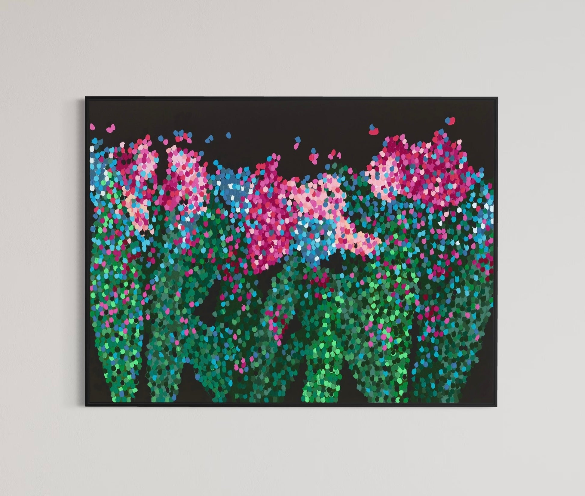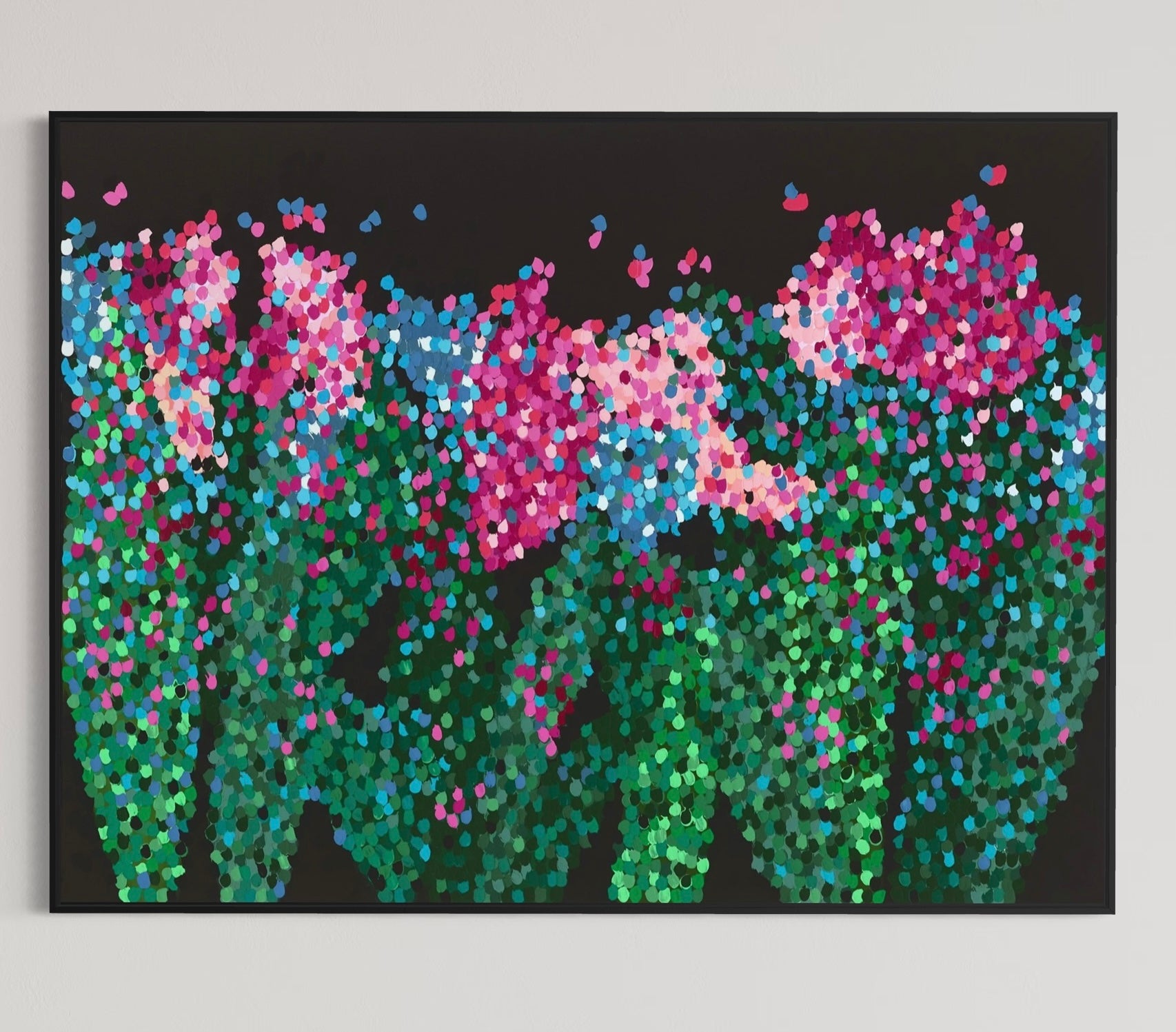 Part of my NEW "Midnight Solace" series, this emotionally driven painting will make a true statement on your wall. Featuring a black background which allows the colors to burst off the canvas, proving that even in the darkest of moments, there is still so much hope, beauty and love around you.